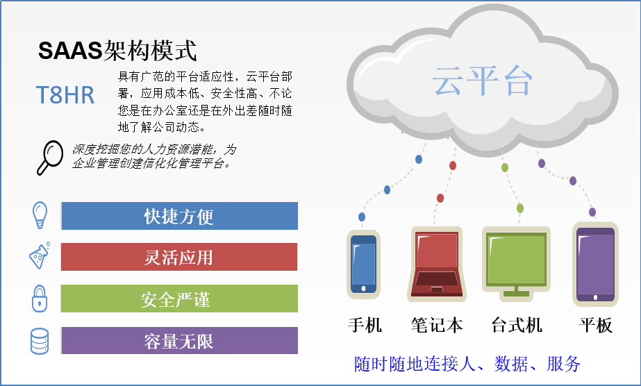 在此背景之下,同鑫科技運(yùn)用大數(shù)據(jù)的成果,為多向公司搭建了eHR云平臺(tái)管理模式,無(wú)論是管理者還是員工,都可以通過(guò)筆記本電腦,手機(jī),平板,臺(tái)式機(jī)等終端,實(shí)現(xiàn)線上線下隨時(shí)隨地連接人、數(shù)據(jù)和服務(wù)。